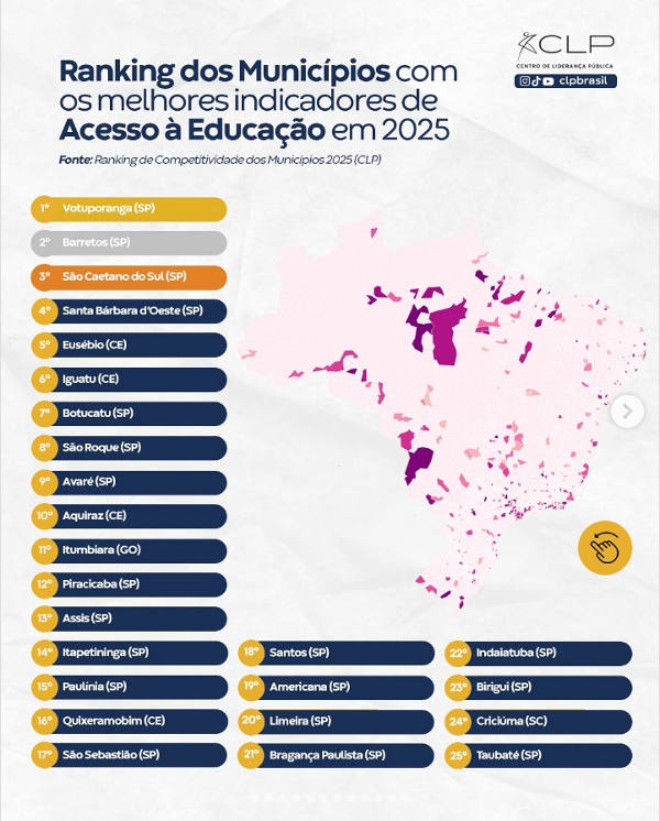 O município de São Roque conquistou uma posição de destaque nacional como a 8ª cidade do Brasil em acesso à educação, segundo os Rankings de Competitividade dos Estados e dos Municípios, divulgados pelo CLP – Centro de Liderança Pública.