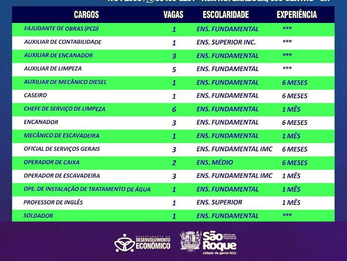 A Prefeitura de São Roque divulga hoje as vagas de emprego cadastradas no Posto de Atendimento ao Trabalhador (PAT).